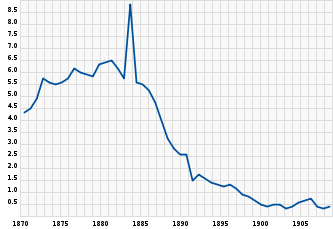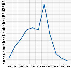 | Добыча каланов на Командорских островах в штуках в период с 1870 по 1924 годы (по материалам архива Командорских промыслов[2]). | Поступление шкурок каланов на аукционы Лондона в период с 1871 по 1910 годы в тысячах штук (по биржевым материалам[35]). |